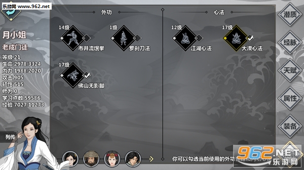 除初始武学(包含【外功】和【心法】),所有武学均可使用无名剑(人物等级在30级内)去除,并返还所有消耗的残章和50%的学习点数;初始武功不可被去除。 李佩芷通过灵心慧质,可以学习额外一种【外功】和【心法】; 主角通过主角模板,可以学习额外两种【外功】和【心法】,并且可以去除初始武学。