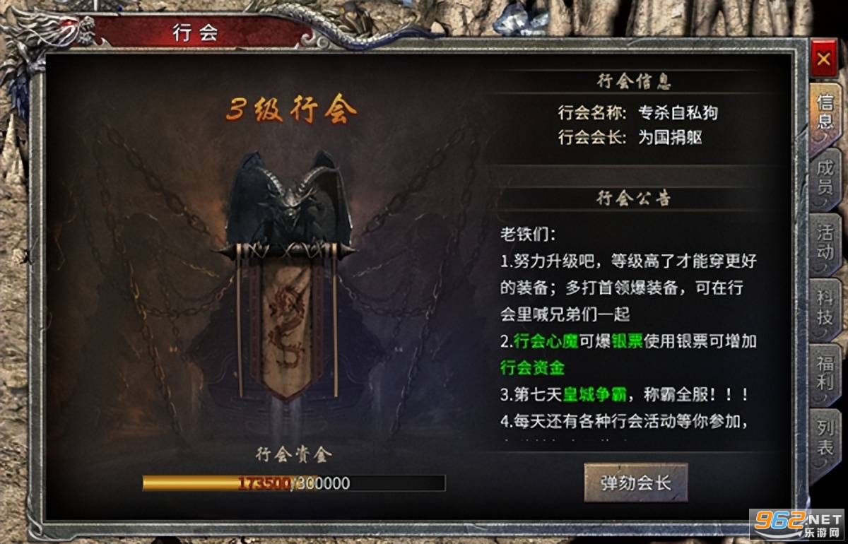 玩家在进到行会里之后,就能够参与各种趣味满满的行会获得,行会里不仅有奖励满满的行会心魔等着你来养成,长老以上职位的玩家喂满一条后开启副本,其他行会成员也可以参与挑战,还有行会科技等着玩家提升英雄固有属性,用贡献值即可轻松提升。更有超多行会福利等着你来贡献商城里兑换。