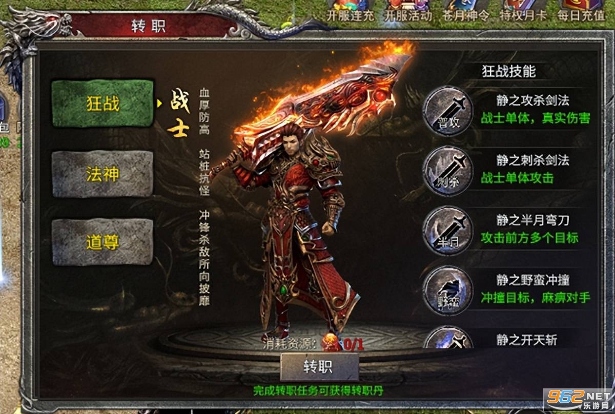 首先给大家介绍转职系统,游戏里的职业依旧是大家熟悉的道法战,玩家的角色满足七转条件的时候就可以开始转职任务,在任务栏出就可以找到自己的转职任务,完成即可获得相应道具,在开服第九天开启跨服的时候玩家就可以到跨服转职祭坛里完成转职,转职需要消耗转职丹。