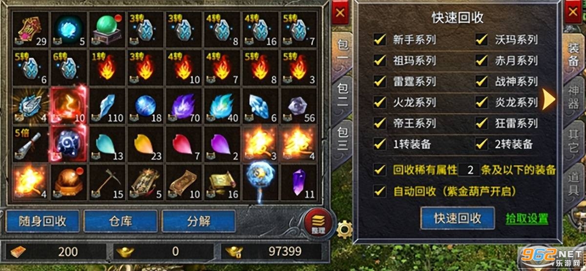 玩家还能在游戏里回收装备材料,找到回收炉即可回收背包里指定装备、材料和神器,回收完成后玩家就能够获取许多元宝和经验值,拥有紫金葫芦的玩家还可以直接打开自动回收,让你在背包满了的时候自动回收已经选定了的材料装备。还想获取更多的装备材料,可以直接使用川川云手机就来多K搬砖。另外,除了以上五个系统,还有炼体玩法,让你可以通过使用各种材料来升级自身实力,提升自己的各项属性,其中分别有神体、圣体、护身、阵法、封号五个方面可以进行修炼。