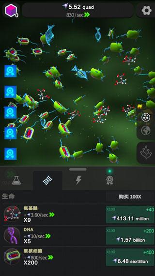 1、虽然这款游戏在玩法方面比较简单,毕竟是放置挂机游戏,仅凭点点点就可以了,但在元素的构建上却非常的全面,从最细微的氨基酸、DNA到后期的哺乳动物,从水、陆到最后的空,各方面都有所涉及,而且其中还有许多细分,非常的经典耐玩。