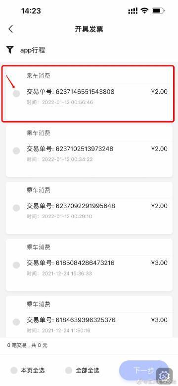 4、选中你要开发票的消费单号,然后点下一步。