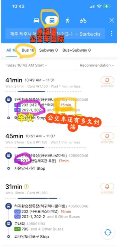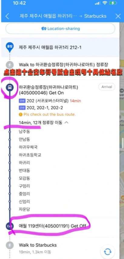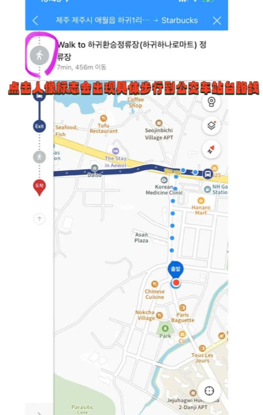 点击一条路线就会出现具体导航方案,如图4和图5点击公交车标志,就有具体站台名字和多少站,这样就算不能看懂韩语也知道要坐几个站。