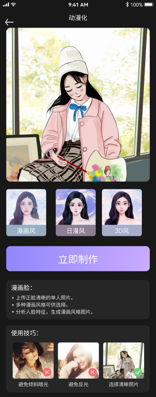 一键对照片进行动漫化处理,同时还提供多种艺术风格特效选择;