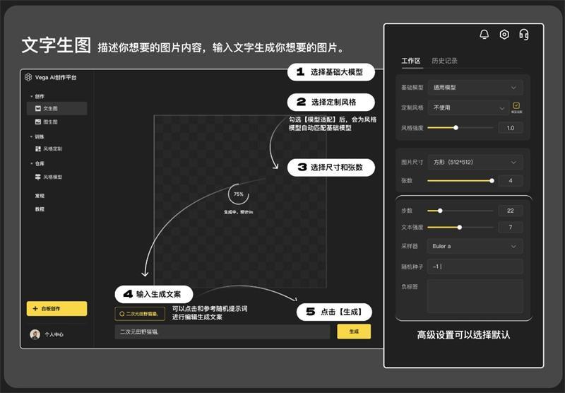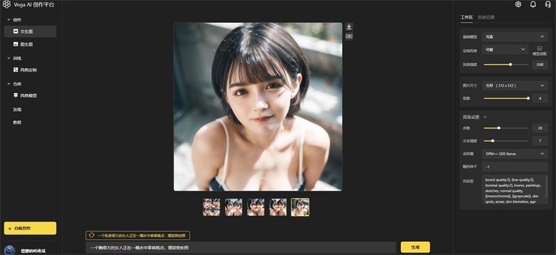功能非常强大可以轻松体验ai创作乐趣的一款神器,Vega ai创作平台,软件中功能是免费的,还可以根据你的风格定制出专属的效果,软件简单好用,使用微信登录就可以操作,支持文字生图的功能,设置基础模型就可以定制出你想要的图片。