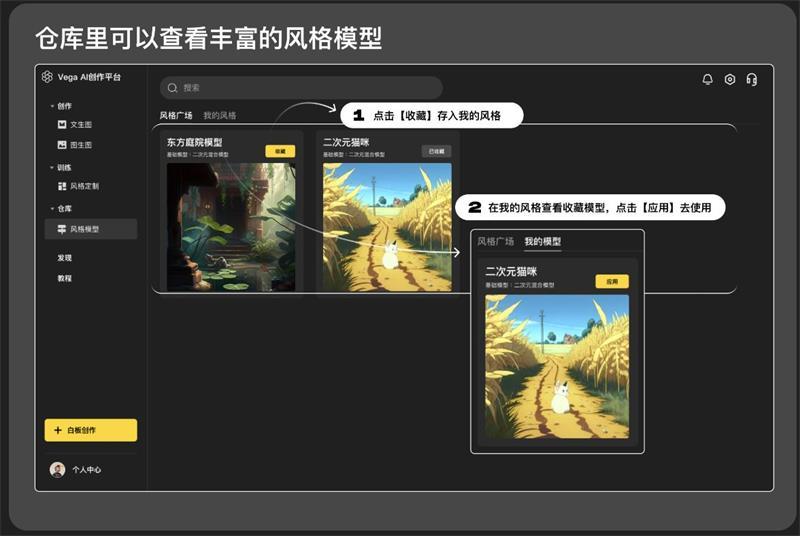 或许你会说,之前不是可以大模型 lora 小模型组合搭配生成不同风格的图片嘛,没错,这个 Vega AI 也支持。