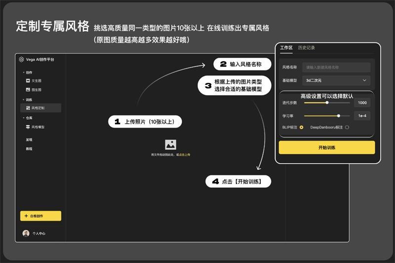 3、定制专属风格,选择质量同一类型的图片10张以上,在线训练出专属的风格。