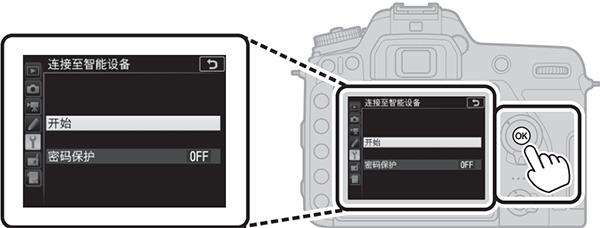 1、在设定菜单中选择连接至智能设备,然后加亮显示开始并按下ok键