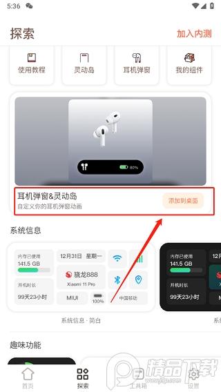 2、进入软件后,找到耳机弹窗&灵动岛,选择添加到桌面。