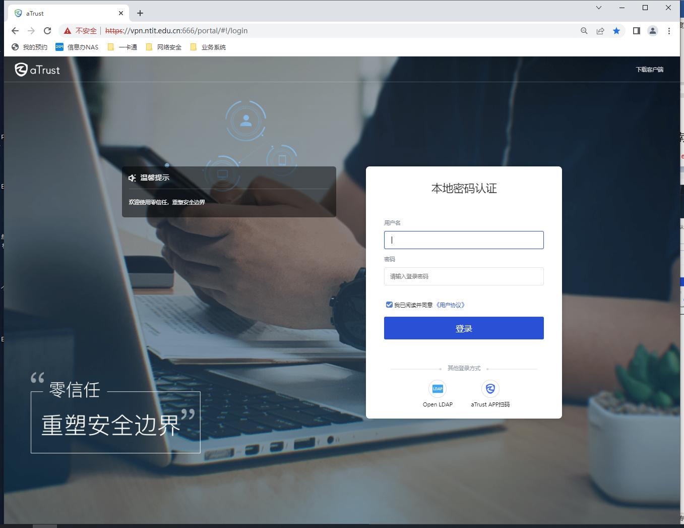1、使用浏览器在网址栏输入https://vpn.ntit.edu.cn:666