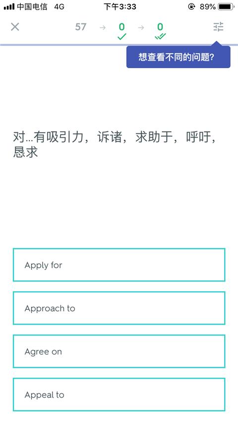 学习:学习模式是我最最推荐的模式之一!这个模式里面会出现所有学习集里的单词 以多项选择/单词卡/判断题/书写题 四种题目的形式出现(可在设置里面设置学习题目类型)每轮大概有7个单词左右 每个单词重复两遍 如果你回答问题错误 这个单词又会再次重复 直到你答对两次这个单词的题目为止 和平常的背单词模式不一样 重复这个设定能帮助我们加强对单词的记忆 另外 每轮过去会显示你已经背了百分之多少 也算是一种激励?(笑)