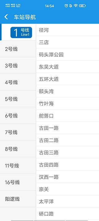 点击"车站导航"栏目,进入车站导航主界面,显示了各条地铁线路的站点名称,选择需要查看的站点,即可跳转到该站点所在的位置。