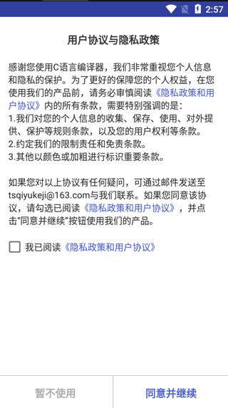 1、在本站下载安装c语言编译器安卓最新版,运行软件,阅读协议并同意;
