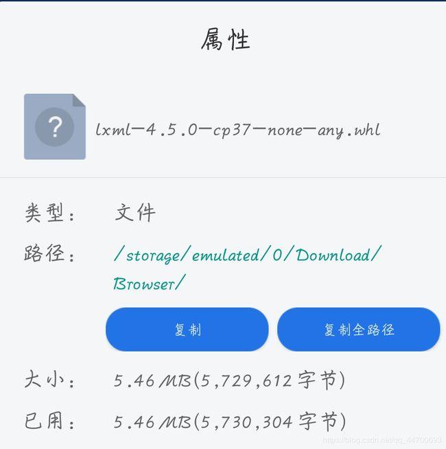 /storage/emulated/0 $ pip install /storage/emulated/0/Download/Browser/lxml-4.5.0-cp37-none-any.whl Processing ./Download/Browser/lxml-4.5.0-cp37-none-any.whl Installing collected packages: lxml Successfully installed lxml-4.5.0/storage/emulated/0 $