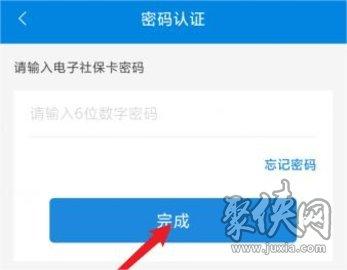 3、密码认证页面,输入社保卡密码,点击完成,就可以完成社保卡的认证了