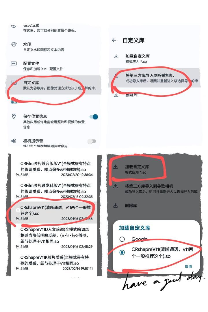 拍照界面下拉点击[更多设置]->[自定义库]->[将第三方库导入到谷歌相机]->找到库加载后切换即可。