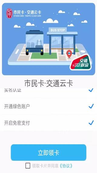点击【交通云卡】,申领“市民通·交通云卡”(注:账户将为您开启小额免密自动支付功能。每次使用前请确保账户余额大于十元。)