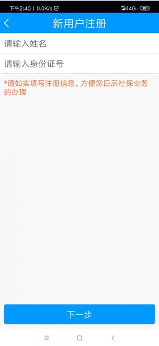 3、点击“新用户注册”输入姓名和身份证号然后点击下一步