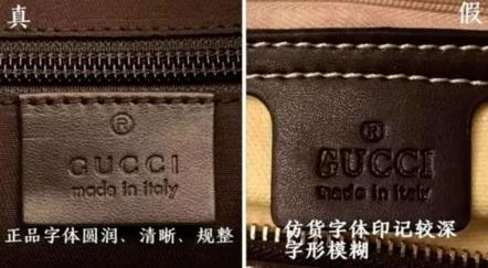 正版Gucci上小标签内外的字都非常清楚,是印上去的,手工十分细腻,而一般冒牌货标签上的字一看就像打印上去的,手工又粗,字体也看不清楚。