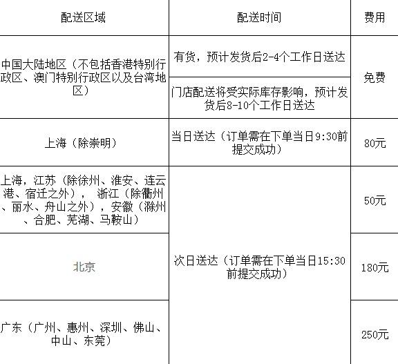A:针对不同的地区及时间,我们提供多样化的配送方式,具体请参见结账页面可选配送方式。所有配送方式及费用列表请详见物流配送表。