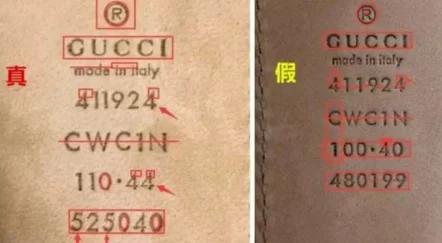 真品内部有个小标签,标签外面注明“Gucci-Made In Italy”,内部则注明款式号码(model nos)及批号(batch nos),假货内衬标签上的字体则可能较为模糊,标签背面也没有编号。