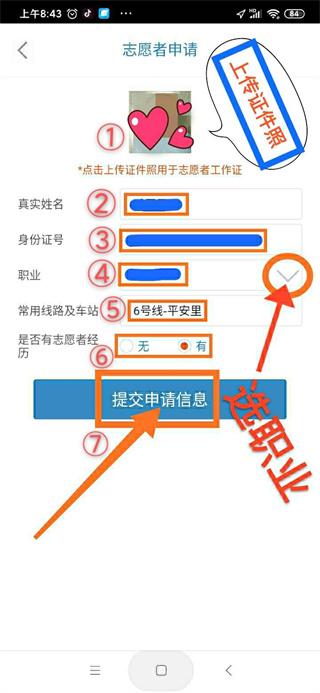 3、进入“提交申请信息”→点击“心手标”需要上传本人证件照→输入真实姓名→输入身份证号→选择“职业”→选择“常用线路及车站”→选择“是否有志愿经历”→点击“提交申请信息”键;