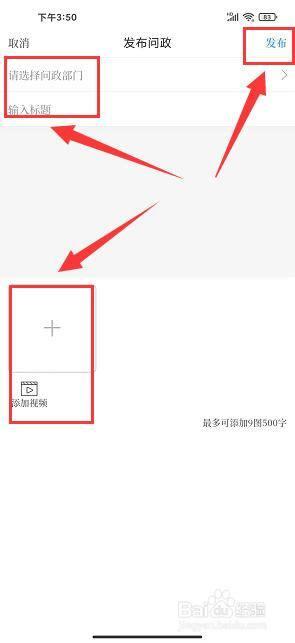 进入发布问政窗口,选择问政部门、输入标题、输入问政内容、添加视频,点击【发布】。