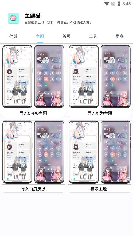 3、个性化定制功能:主题猫app支持个性化定制功能,用户可以根据自己的喜好和需求,对壁纸进行裁剪、调整亮度、对比度等操作,打造独一无二的手机桌面。此外,还提供了多种主题模板供用户选择,一键应用即可快速更换手机主题。