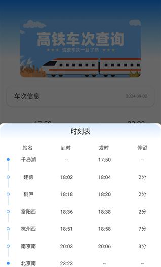 4、用户可查看列车的多项信息,包括经停站、发车时间、停留时间等,提供详细的列车时刻表,帮助用户了解列车运行情况。