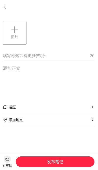 然后便会进入发布笔记的编辑界面,在这里你需要填写标题、正文、配图、话题、位置地点等细节