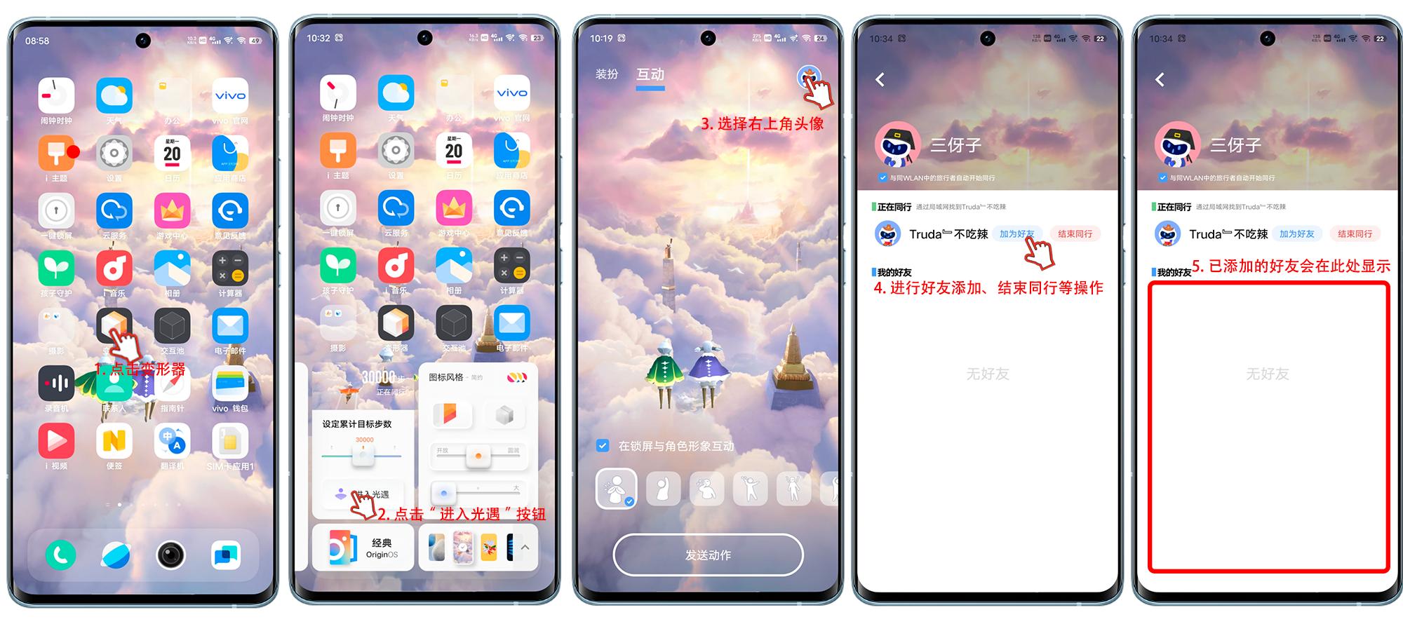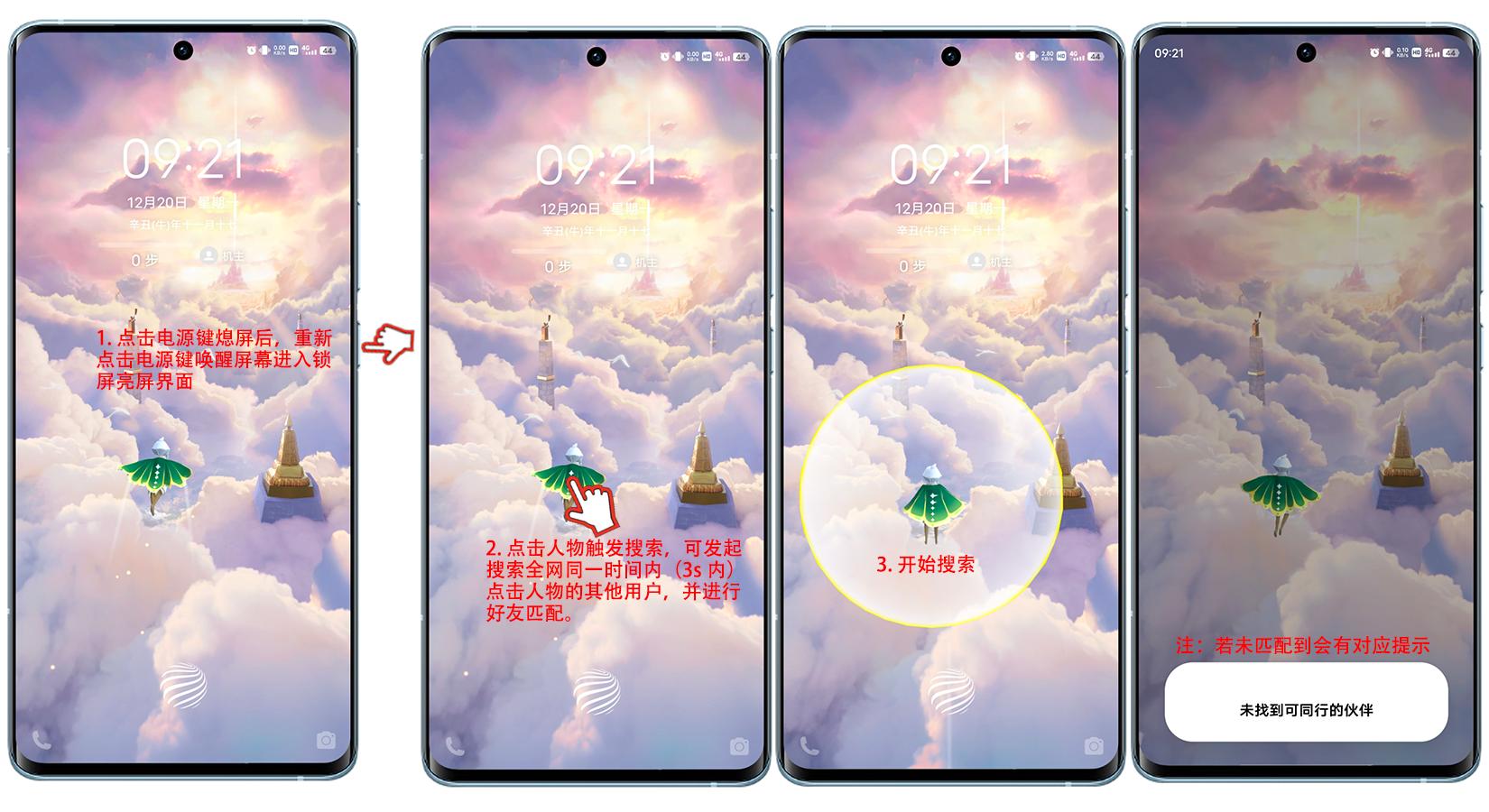 搜索好友,操作方法1:单人时,点击人物,可发起搜索全网同一时间内(3秒内)点击人物的其他用户,并进行好友匹配。