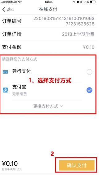 5、点击【缴费】按钮,选择可用的支付方式,然后点击【确认支付】,建议使用“支付宝”支付;