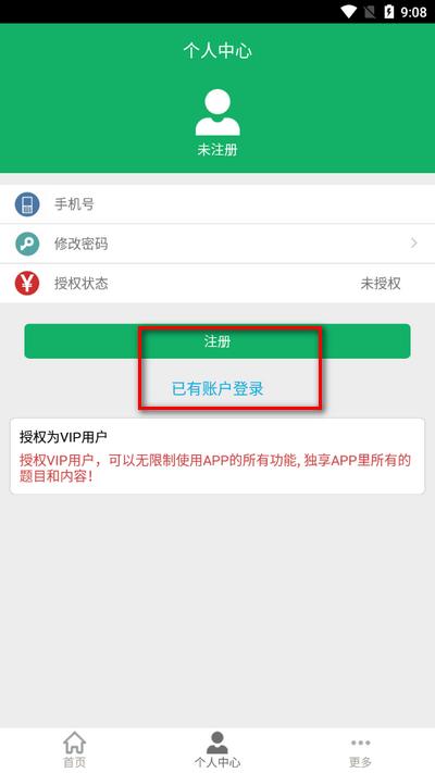 2、点击个人中心,有账号点击已有账户登录,无账号点击注册