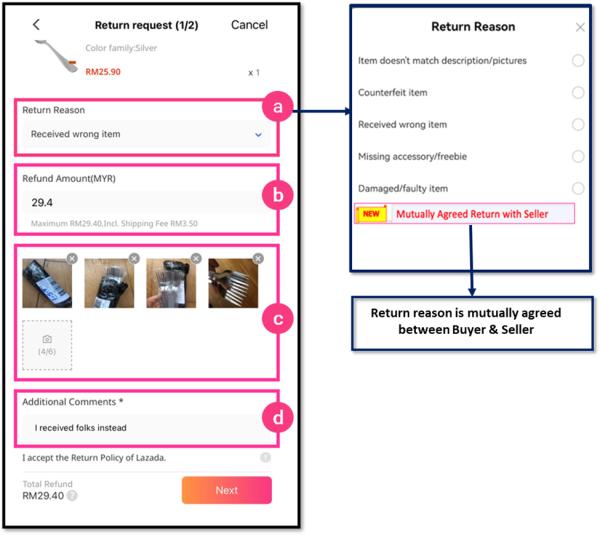 拒绝退货–如果您的退货请求中没有足够的证据或索赔不合理,卖家可以拒绝您的退货申请。当您的返回被拒绝时,您可以与Lazada进行争执,以寻求解决方案。