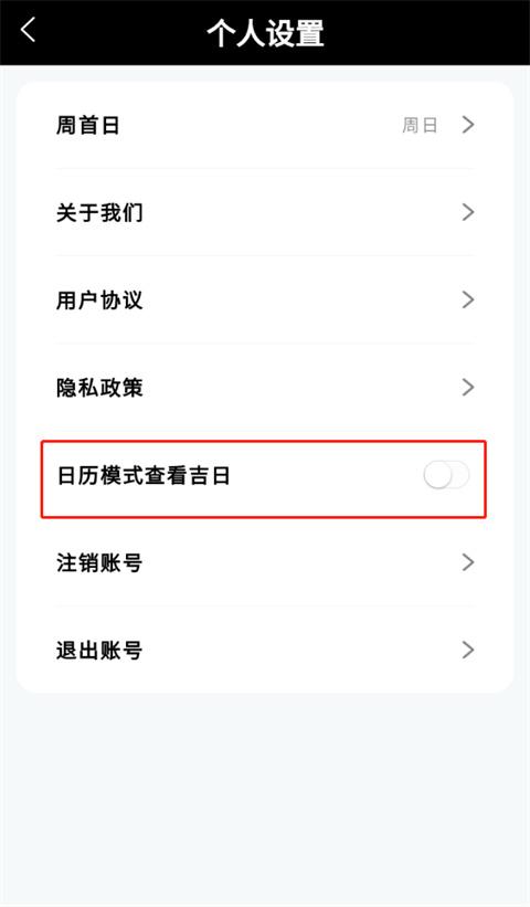 3、然后就可以在“个人设置”页面选择“日历模式查看吉日”了。