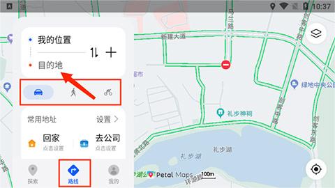 1、打开Petal出行app,进入“路线”界面,在“目的地”栏目输入目的地位置,然后选择下方出行方式,