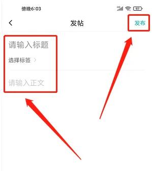 进入发帖界面,输入帖子标题、选择标签、输入正文内容,点击【发布】。