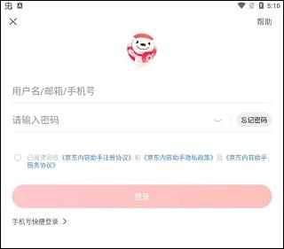 在登录页面选择京东账号登录方式后,在账号输入框输入用户名或手机号并输入密码,点击登录后完成登录。
