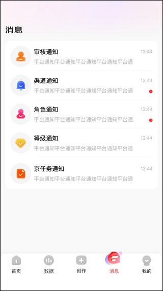 点击京东内容助手底部的消息Tab,进入消息列表,可查看官方推送的审核通知、渠道申请通知、角色认证通知,成长等级通知和京任务通知。