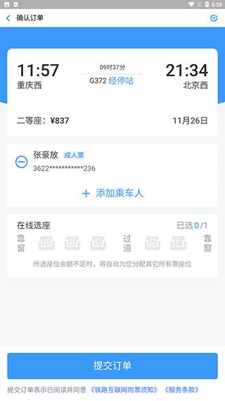 3、核对好时间和地点后,选择乘车人和在线选座,点击提交订单即可购票成功。