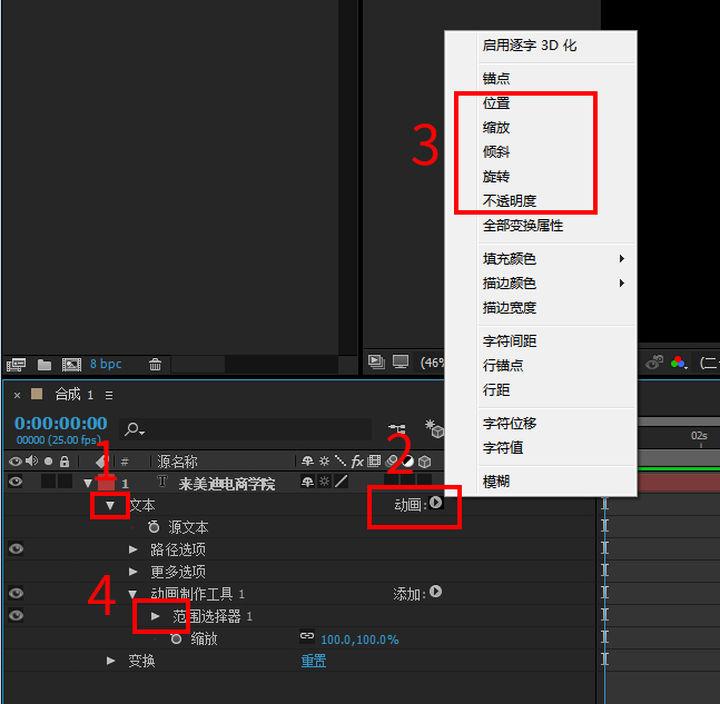 接下来选择文本,然后右键点击动画,选择这里有多个效果,这里我选择了缩放,接着点开范围选择器;