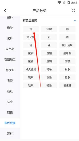 2、然后找到有色金属的分类选项,其中铜就在其中