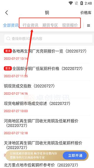 3、点击铜之后你就可以看到各地铜相关的信息,其中有价格表,行业资讯等都可在线浏览