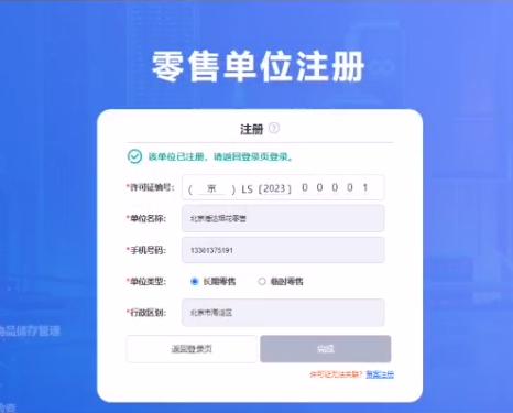 第三步:进入注册界面(见下图),输入许可证编号,系统自动带出相关信息,核对无误后,点击完成。