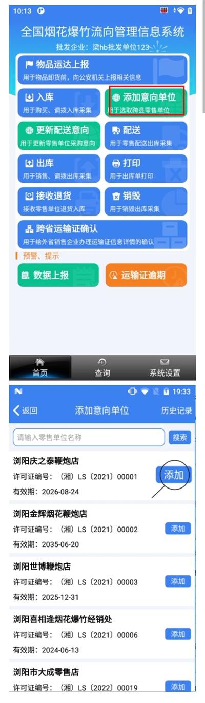 第一步:等待批发企业使用批发手持机,点击"添加意向单位",选择需要配送辖区外的零售单位进行"添加";