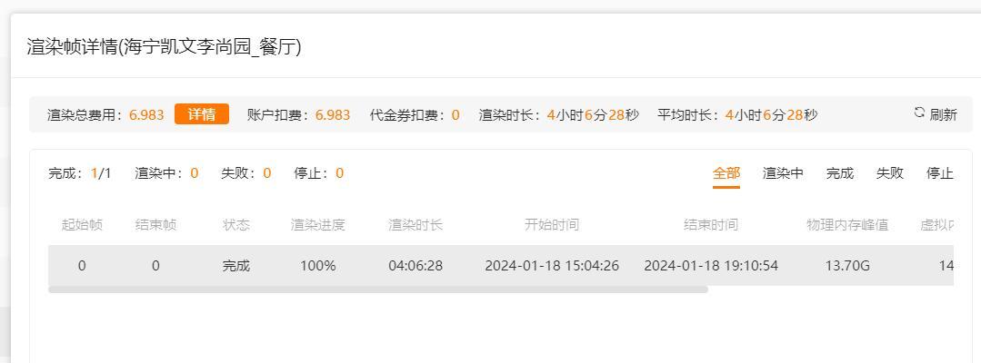 中间是渲染任务的一些基本情况,可以查看渲染任务是否完成,上传进度,渲染进度,渲染时间等。