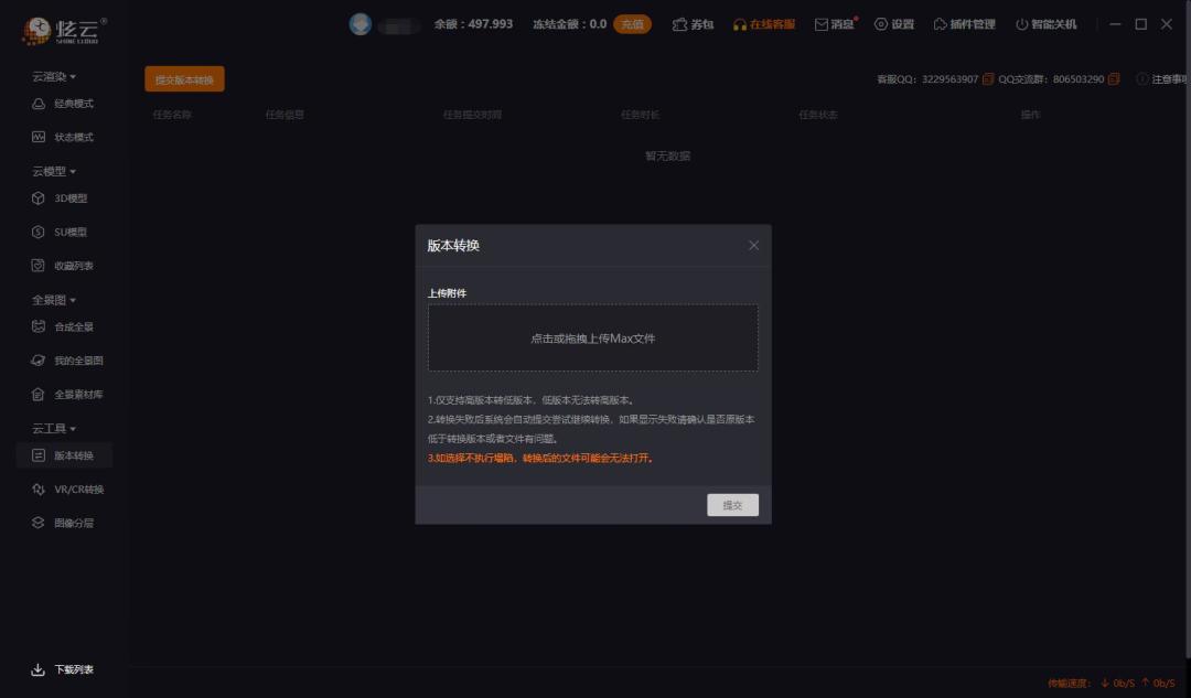 炫云客户端左边一排除了渲染任务以外,还有模型、全景图、模型版本转换等功能,用户可以直接在客户端上寻找自己喜欢的模型下载,也可以制作效果图或者模型版本转换。