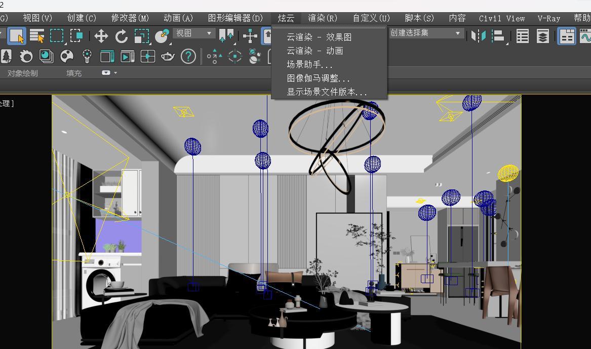 2、打开需要渲染的任务,在菜单栏找到炫云,点击炫云会弹出效果图或者动画等选项,根据你自己的情况选择就可以了,是效果图就选择效果图,是动画就选择动画。