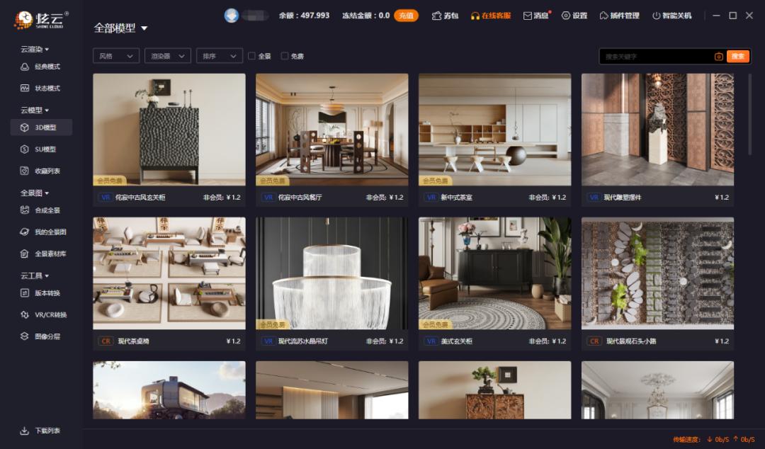 设计师在做图的时候需要用到各类模型素材,如果仅依靠个人力量画模型,则会带来沉冗的工作量。从而导致项目周期拉长,效率降低,对客户交付十分不利。故而,绝大多数设计师都会选择在专业模型网站上寻找所需的模型素材。基于此背景,炫云客户端设有模型库。各类模型应有尽有,素材丰富多样,可以满足不同设计需求,提供给设计师下载使用