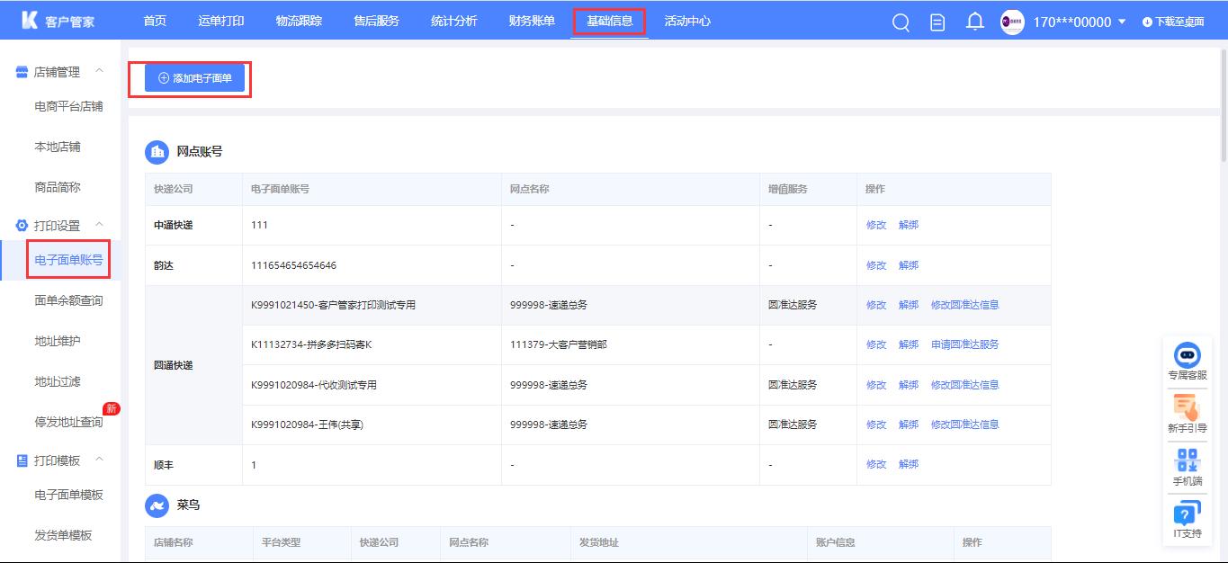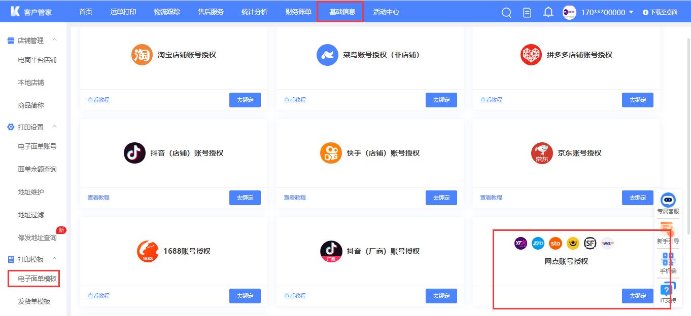 客户管家网页端:基础信息-打印设置-电子面单菜单,点击添加电子面单按钮,选择网点账号授权去绑定